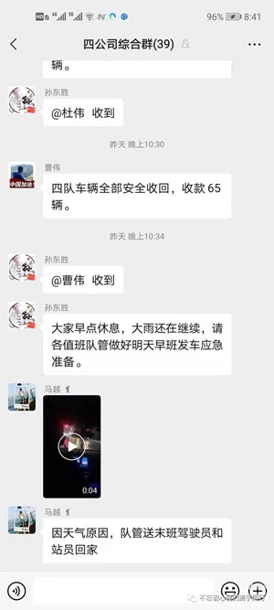 一是信息共享??偣就ㄟ^微信群、車內(nèi)監(jiān)控、GPS定位等手段,及時(shí)將線路運(yùn)行情況、危險(xiǎn)路段道路積水情況、場站排水情況等信息進(jìn)行共享聯(lián)動(dòng),以確保及時(shí)準(zhǔn)確下達(dá)工作指令。