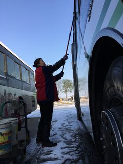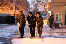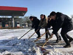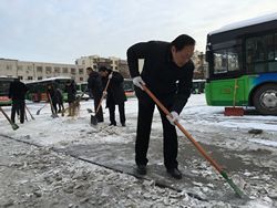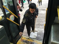 5點,分公司、路隊兩級管理人員全部按照分工,到達指定線路、樞紐站,開始協(xié)助司機加水、熱車,做好發(fā)車前的準備。6點半,總公司、分公司機關管理人員開始清掃站點積雪;客流集中的各大站點,管理人員已經(jīng)在疏導乘客,指揮車輛進出站。初冬的凌晨溫度最低,冷風直透心底。上午9點多,當直播五十分和唐山交通臺的記者趕到遠洋城站點采訪時,一公司的管理人員已在此堅守了四個多小時。大雪讓車身結了厚厚的一層冰和泥,保潔員們用工具一點一點艱難地清理著。